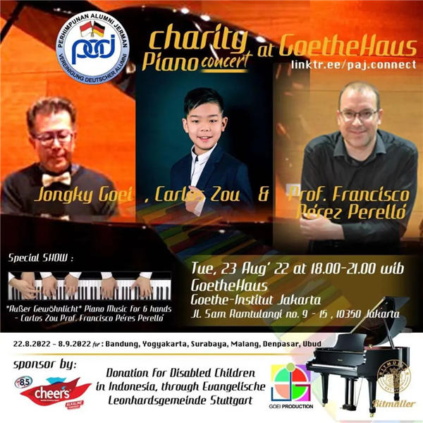 2022年8月23日,在印度尼西亚首都雅加达,德国歌德学院举行了一场慈善钢琴音乐会,旨在为印尼的残疾儿童进行捐款。出生于印尼东爪哇玛琅市(MALANG)的德国钢琴音乐家Mr. Jongky Goei(魏进荣教授)应邀出席,在里特米勒大型三角演奏钢琴上奏响爱之音。
