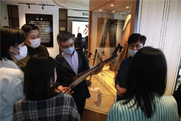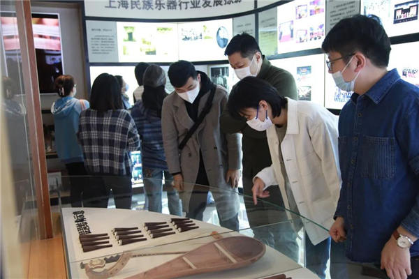 下午,项目团队一行来到民族乐器陈列馆进行参观。在陈列馆,老师们看到了许多结合了中国优秀文化、传统工艺、非遗技艺的高文化附加值的乐器产品,纷纷用手机记录下琵琶的设计细节。除了乐器外,陈列馆里还摆放着企业编印的《图说琵琶》《上海民族乐器制作技艺》等记录乐器制作历史和技艺的书籍,这些书籍也引起了老师们的兴趣。