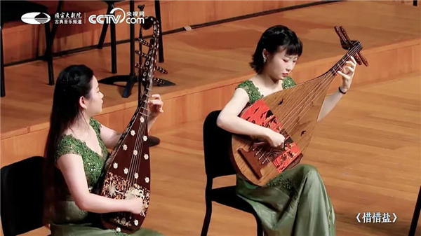 琵琶重奏《惜惜盐》 既以敦煌壁画为灵感,运用6把形制各异的琵琶,在舞台上直观地展现了几个重要历史节点上琵琶外形的变化。同时,具有反差的声音色彩交错进行,仿若跨越时空的对话,唤醒了沉睡千年的古老声音。从水声、风声、沙声中铺陈开来,鲜明的节奏、明朗的曲调让愉悦的氛围在音乐会现场蔓延。作品由琵琶专业委员会常务副会长、中国音乐学院杨靖教授,于2012年委约作曲家刘青女士为杨靖琵琶室内乐团而作。