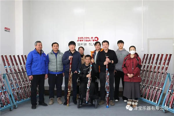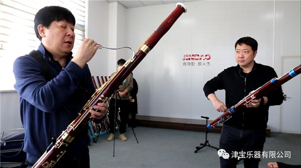 近日中央音乐学院李岚松教授、四川音乐学院宋世彬副教授及两位巴松专业老师受邀来津宝乐器参观指导,总经理刘运斌和主营木管的第三分厂厂长热情接待。两位教授试吹了津宝乐器研发生产的多款型号巴松,他们对津宝巴松乐器的设计和生产做出了很大的认可,多次提到无论是从乐器的质量音准上,还是从外观工艺上,津宝巴松都达到了行业一流水准,仅在小部分细节上还有进步空间。