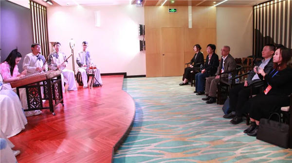 最后,一行人来到展播厅欣赏了企业旗下新艺民族室内乐团的排练。《三六》清新活泼,《凤阳花鼓》俏皮欢快,《花好月圆》悠扬欢畅,彰显了中华传统音乐文化的深厚底蕴。