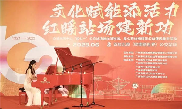 在中国共产党成立102周年之际,为深入开展学习贯彻习近平新时代中国特色社会主义思想主题教育,营造党群同心庆“七一”的浓厚节日氛围,持续深化“红暖站场”党建品牌建设,6月25日上午,广州公交集团交通站场中心携手珠江钢琴集团等单位举办2023年迎“七一”公交站场迷你博物馆、爱心驿站揭牌暨公益便民集市启动仪式,于百顺北路(岭南新世界)红色文化生态文明示范站场火热开展。