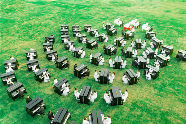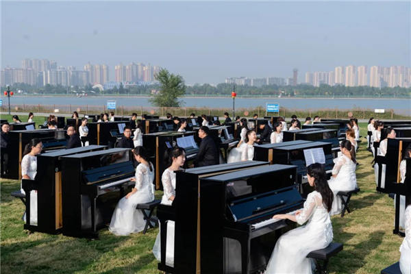 9月27日,秦川乐器携百架钢琴惊艳亮相滹沱河艺术生态岛,带来恢弘壮阔的百人钢琴音乐盛会。