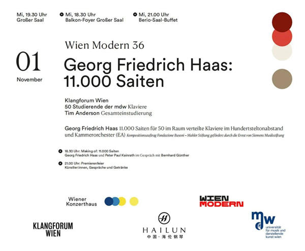 北京时间11月1日,继博尔扎诺世界首演后,“宇宙之声”项目《11,000根弦》将在维也纳音乐厅再度献演,这次演出是维也纳现代音乐节(Wien Modern)的重磅推出节目,由维也纳声音乐团及50位钢琴家在50架海伦钢琴上奏响,这是奥地利著名作曲家乔治·弗里德里希·哈斯(Georg Friedrich Haas)受“费鲁奇奥·布索尼·古斯塔夫·马勒基金会”委约而为室内乐队与50台钢琴而创作的《11,000根弦》。