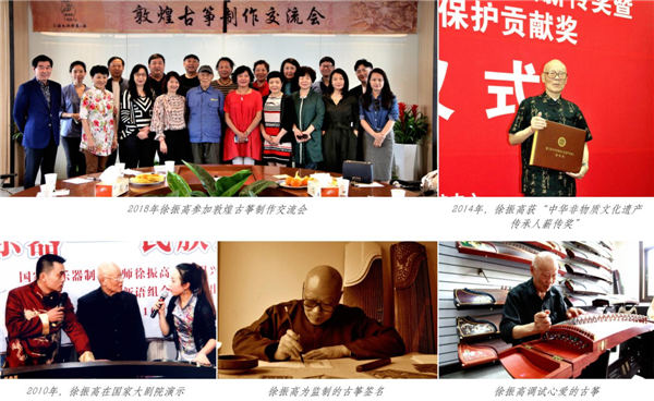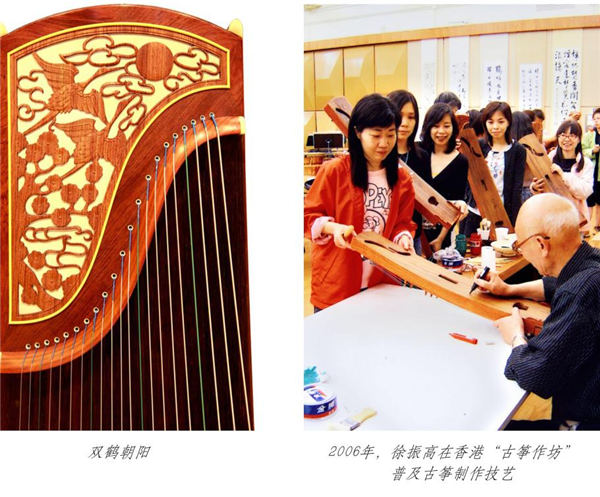 1960年诞生的第一台S型岳山古筝上,就有由徐振高设计、经专业老师指导修改,以松、鹤、朝阳为主题内容的图饰花板。到后来S型21弦古筝流行开来的时候,人们把两只仙鹤穿过松枝飞向太阳的图案直观地称为“双鹤朝阳”。几十年传承发展下来,千年古筝的新面貌“双鹤朝阳”也已成为上海民族乐器一厂“敦煌牌”古筝的经典款式。此后,徐振高的古筝装饰“创举”得到了延续和拓展,1998年全国古筝制作大赛后,“蕉窗夜语”“梅庄琴韵”“香墨垂弦”“五彩呈祥”和“玉影长驻”等数十种花色相继问世,多种雕刻、针刻、绢画、镶骨、漆画、珐琅等装饰性工艺融于古筝,呈现了百花齐放、群芳争艳之势。