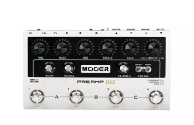 在全球对MOOER独创的“智能逆向建模技术”采集的前级音色的认可下,我们打造出了一款更具有专业形态的多通道数字前级效果器——PREAMP LIVE,专业落地前级效果器共有四个踩钉,最多可支持加载三组共十二个可独立保存、编辑的高品质前级通道,并在每个独立的前级通道中,带有可前后置选择的BOOST(激励)模块和双降噪门(Noise Gate)模块。当然,作为一款为职业乐手打造的产品,PREAMP LIVE还有非常丰富的功能性接口,如可记忆开关的回路接口(EFFECT LOOP),可独立开关并支持加载IR箱模的6.5”输出以及卡侬输出,以及MIDI输入、输出/THRU口等等,帮助专业级别用户丰富其应用场景。