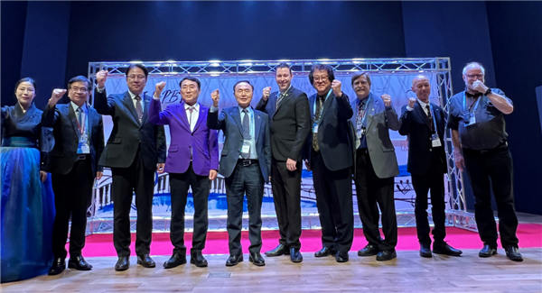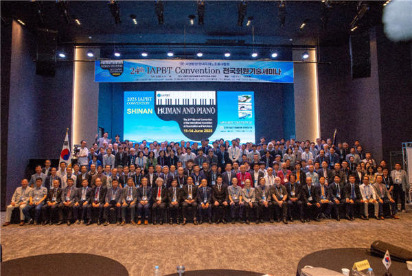 在大会落幕前的最后一晚,组委会精心策划了精彩纷呈的文化展演单元。韩国调律师代表们以钢琴、萨克斯、排箫、吉他独奏及人声演唱,诠释对音乐的理解与热爱;谭宝利团长则以中国竹笛配合钢琴演奏经典曲目《乱红》,完美呈现中国民族乐器与钢琴的艺术融合,二者珠联璧合、相得益彰。悠扬的乐声赢得现场全体代表长时间的热烈掌声,多国协会会长纷纷上前致以赞赏与祝贺,欣赏之情溢于言表。