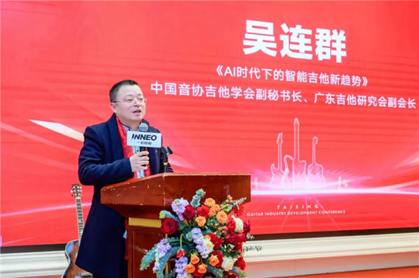在主旨演讲环节,三位行业专家从不同维度分享了深度洞察。上海市吉他艺术协会会长高艺以《手工原声吉他的艺术价值》为题,阐述了手工琴作为高端市场价值标杆的意义,并探讨了手工琴与工厂琴之间共生共荣的产业关系。原中国音协吉他学会副理事长、广东吉他研究会监事长黑杭林在《吉他艺术的“顺势而为”》中,重点分析了智能吉他在教学场景中的应用价值,指出其能有效满足从中老年、儿童兴趣启蒙,到专业演奏者舞台表现等多层次需求。中国音协吉他学会副秘书长、广东吉他研究会副会长吴连群则以《AI时代下的智能吉他新趋势》为题,从传统痛点、核心价值等维度,阐释了智能吉他如何重塑用户体验。