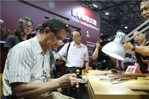 中央音乐学院教授郑荃带来小提琴琴头制作展示、中央音乐学院提琴制作专业研究生帅玉玲带来提琴面板的内外弧制作展示
