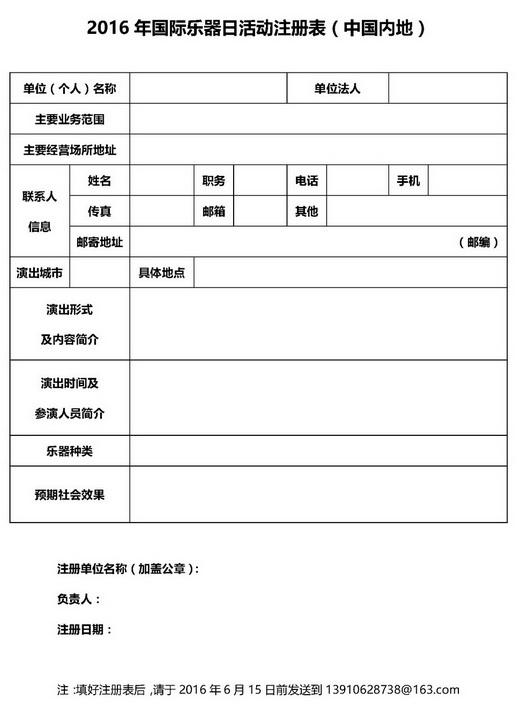 请有意参加此项倡议的单位,在中国乐器协会网站(www.cmia.com.cn)下载中心、微信或其他渠道下载“国际乐器日活动注册表”,填写后于2016年6月15日前报送中国乐器协会,由中国乐器协会统一汇总,并与国际组织交流,使活动与各个国家和地区的“国际乐器日”活动同步。