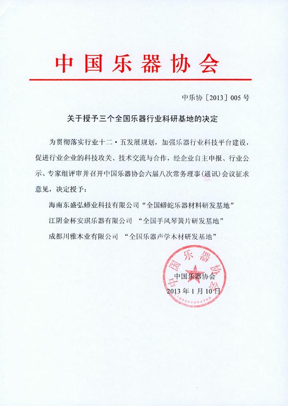 关于授予三个全国乐器行业科研基地的决定-中国乐器协会