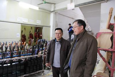 下午,安理事长到广州红棉吉它公司考察,公司董事长兼总经理何志强陪同参观了位于广州海珠区的吉它工厂。红棉吉它公司始建于1957年,原隶属广州珠江钢琴集团,2007年珠江钢琴实施股份制改革,将吉它、提琴和手风琴等企业组建成广州红棉吉它公司,隶属于广州工业发展集团,是纯国有企业。红棉吉它是中国著名品牌,2011年吉它产销量居行业之首,年产销吉它90余万把。何总陪同安理事长边走边介绍企业生产经营情况,2012年虽然国际市场有一些变化,但是对中低档吉它订单影响不大,工厂生产任务很满,老厂区挤得满满的,就连楼角、过道都用上了,为了提高生产效率,又进了几批新设备,公司下决心研发了“光敏漆静电喷涂系统”并申请了国家专利。这项科技创新成果大大提高了吉它表面涂饰质量和生产效率。