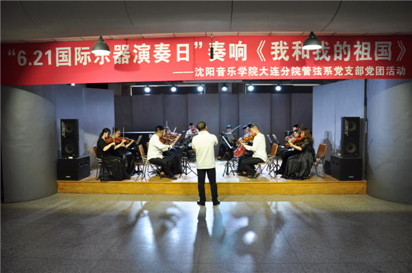 在大连,沈阳音乐学院大连分院管弦系党支部也开展了“6.21国际演奏日走向《我和我的祖国》主题党团活动”,管弦系的师生们饱含热情地奏响了这首经典的《我和我的祖国》。这首歌曲作者秦咏诚正是沈阳音乐学院的老院长,词作者张藜也是沈阳音乐学院的老校友,所以在这样一个日子奏响这首曲目,对于沈阳音乐学院大连分院的师生们来说,更有一番别样的意义。