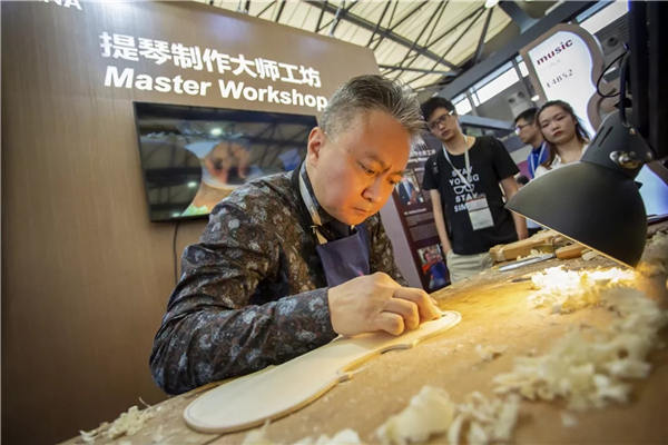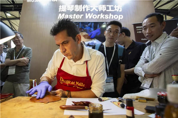 展会第二日的提琴大师工坊人气依旧爆棚,中央音乐学院提琴制作研究中心副主任、国际提琴与琴弓制作大师协会EILA会员高彤彤演示了小提琴面板弧度的制作;意大利制琴师Andrea Schudtz展示了提琴的镶边;意大利制琴师Diego Del Valle Plaza展示了古意大利提琴漆的配方及上漆工艺。