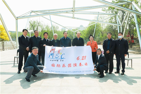 元敏主席和基金会各位领导陪同乐器协会一行参观了“华夏未来城市中心”,并在华夏未来艺术中心举行了“6.21国际乐器演奏日”授旗仪式,“华夏未来”秘书长赵骞代表基金会从孙瑞勇副理事长手中接过“6.21国际乐器演奏日”旗帜及联合主办单位授权书。