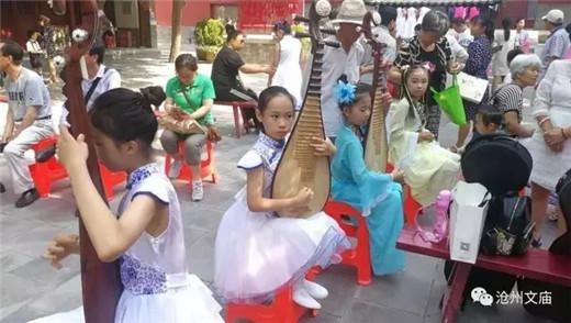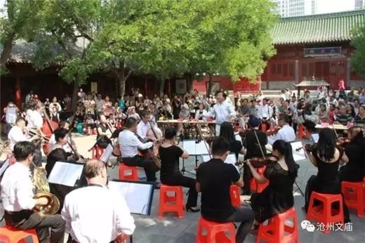 上午9点,开幕式及演出在沧州管弦轻音乐乐团的优美乐曲下正式启动。来自沧州市天乐艺术学校、沧州市东方古筝学校、沧州市实验小学、路华小学的200名中小学生和沧州市管弦乐团的专业演奏家们为沧州市民奉上了一场音乐的盛宴。笛子齐奏,曲调悠扬,悦耳动听;古筝合奏,曲调深厚,纯朴古雅;琵琶合奏,清脆悦耳,令人陶醉。管弦乐合奏,气势恢宏,宽广壮阔;小提琴演奏,舒缓柔美,美妙动听;钢琴独奏,行云流水,温润柔和。天乐艺术学校的60名小学生表演的《虫儿飞》《金蛇狂舞》将演奏会推向了高潮,赢得了专家和观众的一致好评。当天的活动吸引了两千多名市民和游客参与。(沧州文庙)