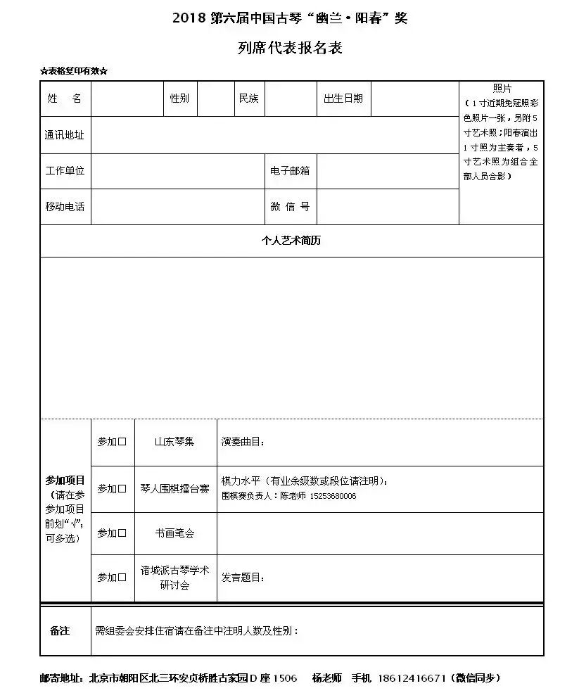 备注:日程安排以现场为准。本次活动组委会鼓励参演者穿着中华民族传统服装演出。参演者所寄个人录像不得作编辑处理,活动结束后恕不退还。本章程的最终解释权及活动中所有音像版权归第六届中国古琴“幽兰·阳春”奖展演活动组委会所有。